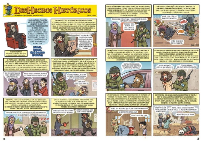 El dibujante Romeu recurre a los tópicos y libelos antijudíos para expresar su particular visión del conflicto palestino-israelí. El personaje que responde a la interpelación “humanitaria” es retratado como religioso ultraortodoxo (con kipá y tirabuzones), con los rasgos fisonómicos estereotipados y haciendo gala de una expresión (“Nuestro buen dinero nos ha costado”) que remite al estereotipo sobre la naturaleza conspirativa, poder e influencia de “los judíos”, así como su irremisible asociación con el dinero y la avaricia.Una caricatura que no es muy diferente a las publicadas por Goebbels en la Alemania nazi, que desató un odio brutal hacia los judíos y que terminó, como todos sabemos, desangrando Europa