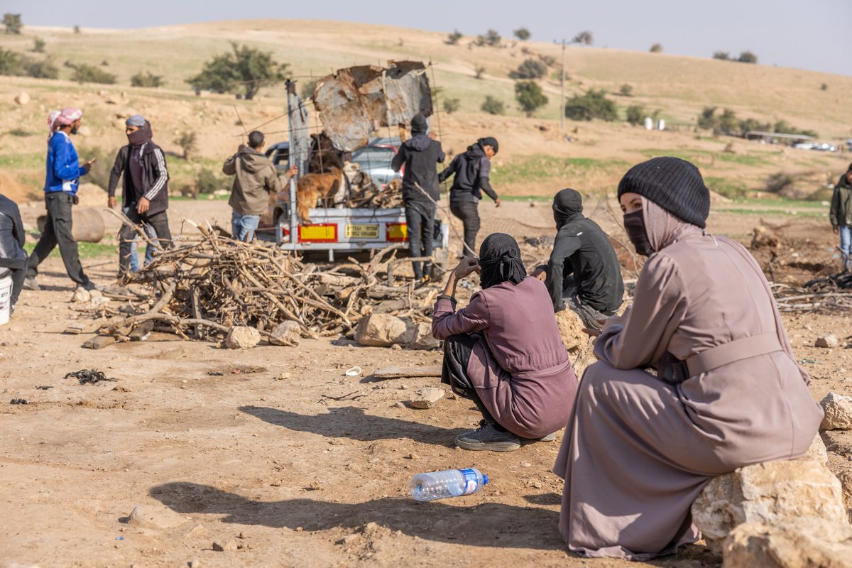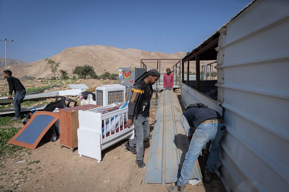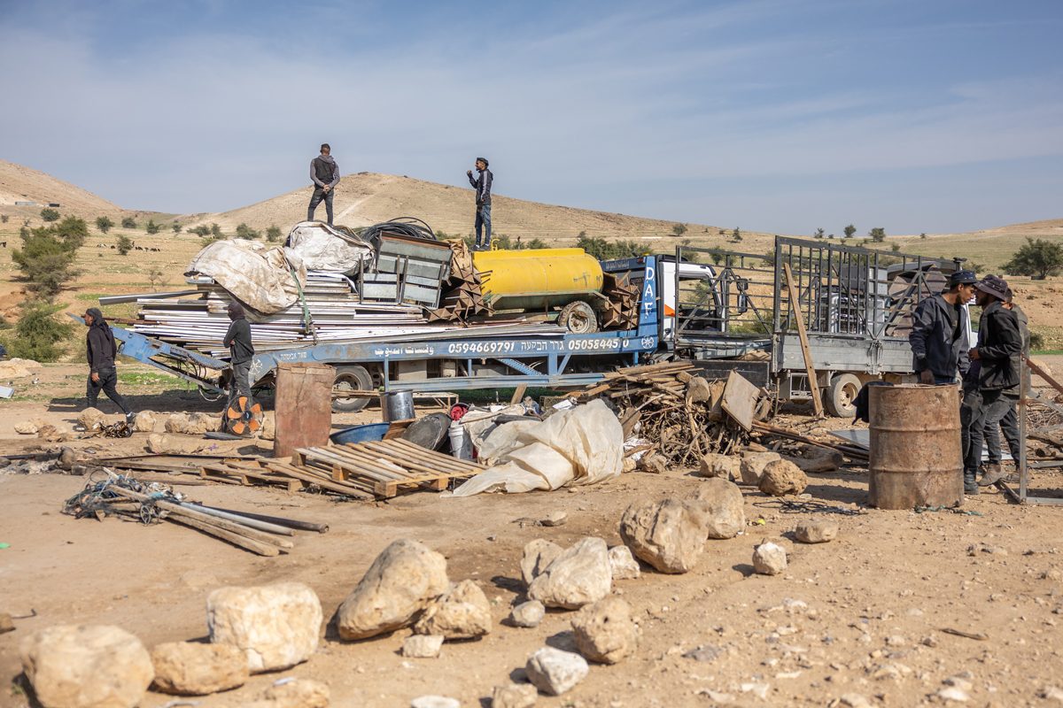 Residentes de Ras Ein al-'Auja cargan piezas desmanteladas del edificio en un camión antes de partir. Foto: Avishay Mohar, B'Tselem, 8 de enero de 2026
